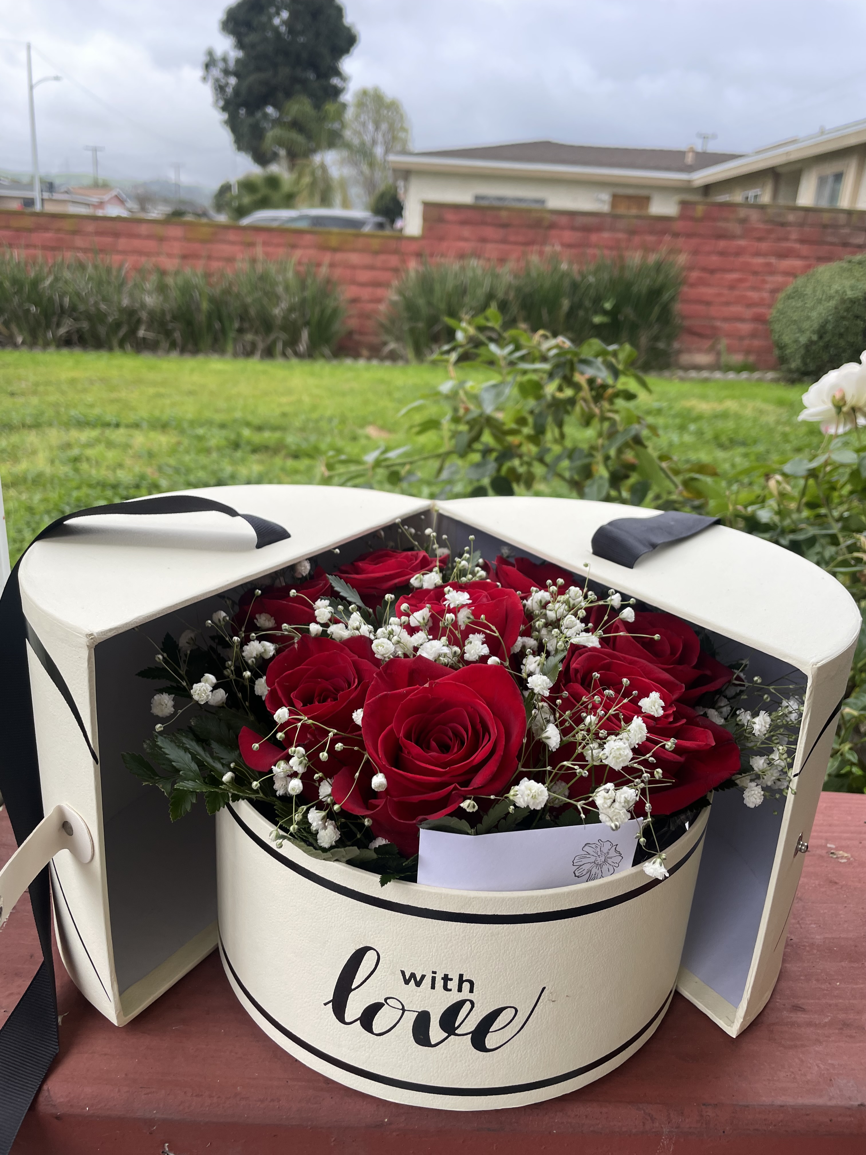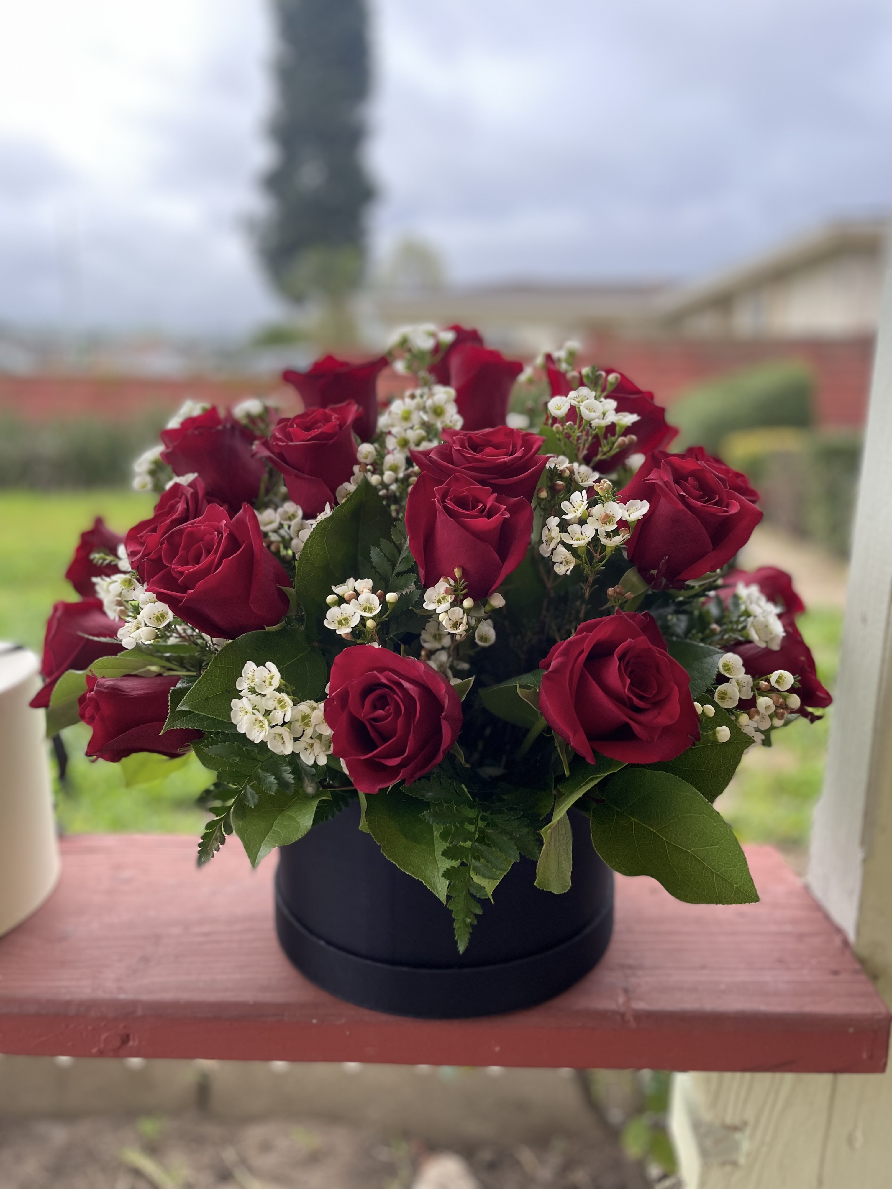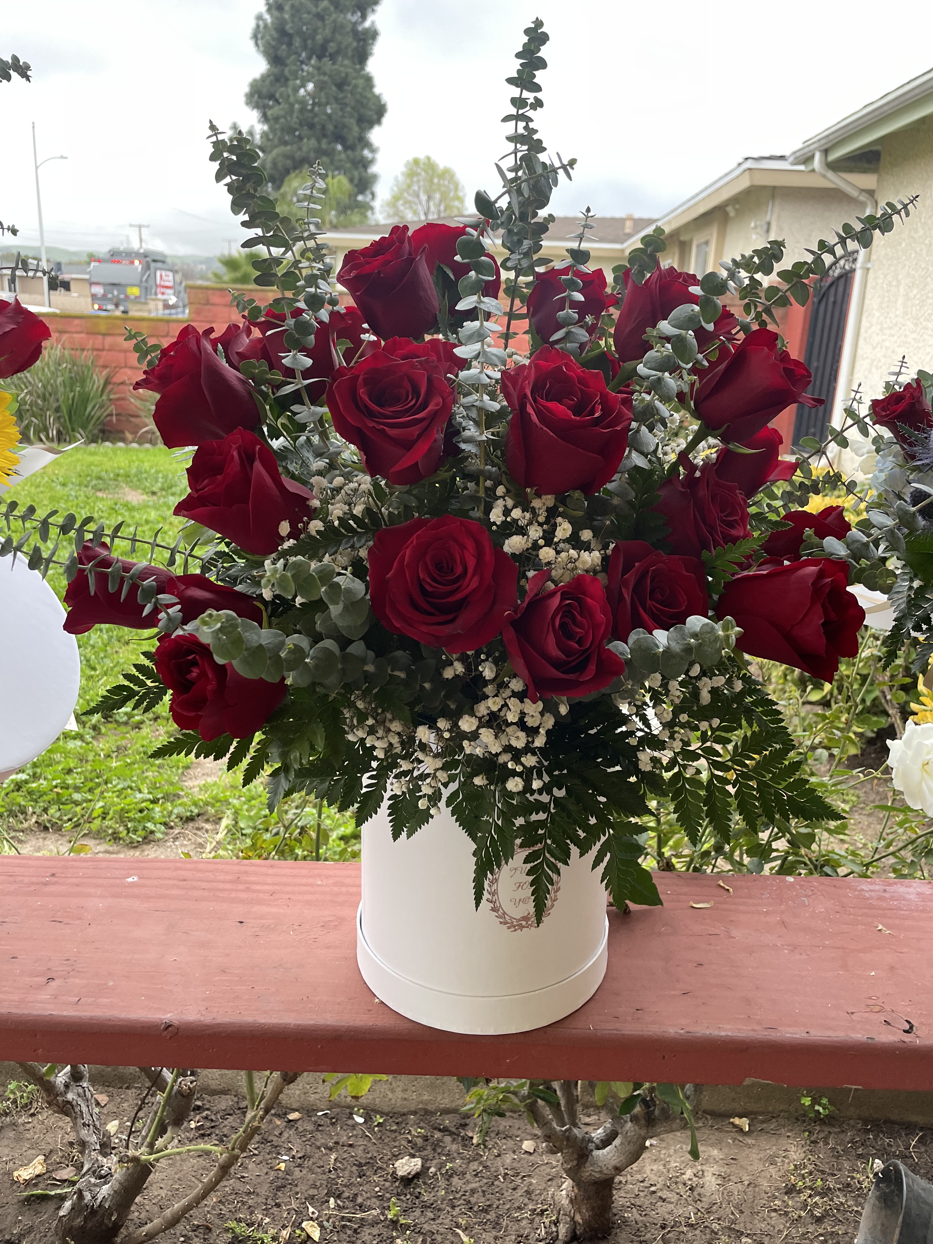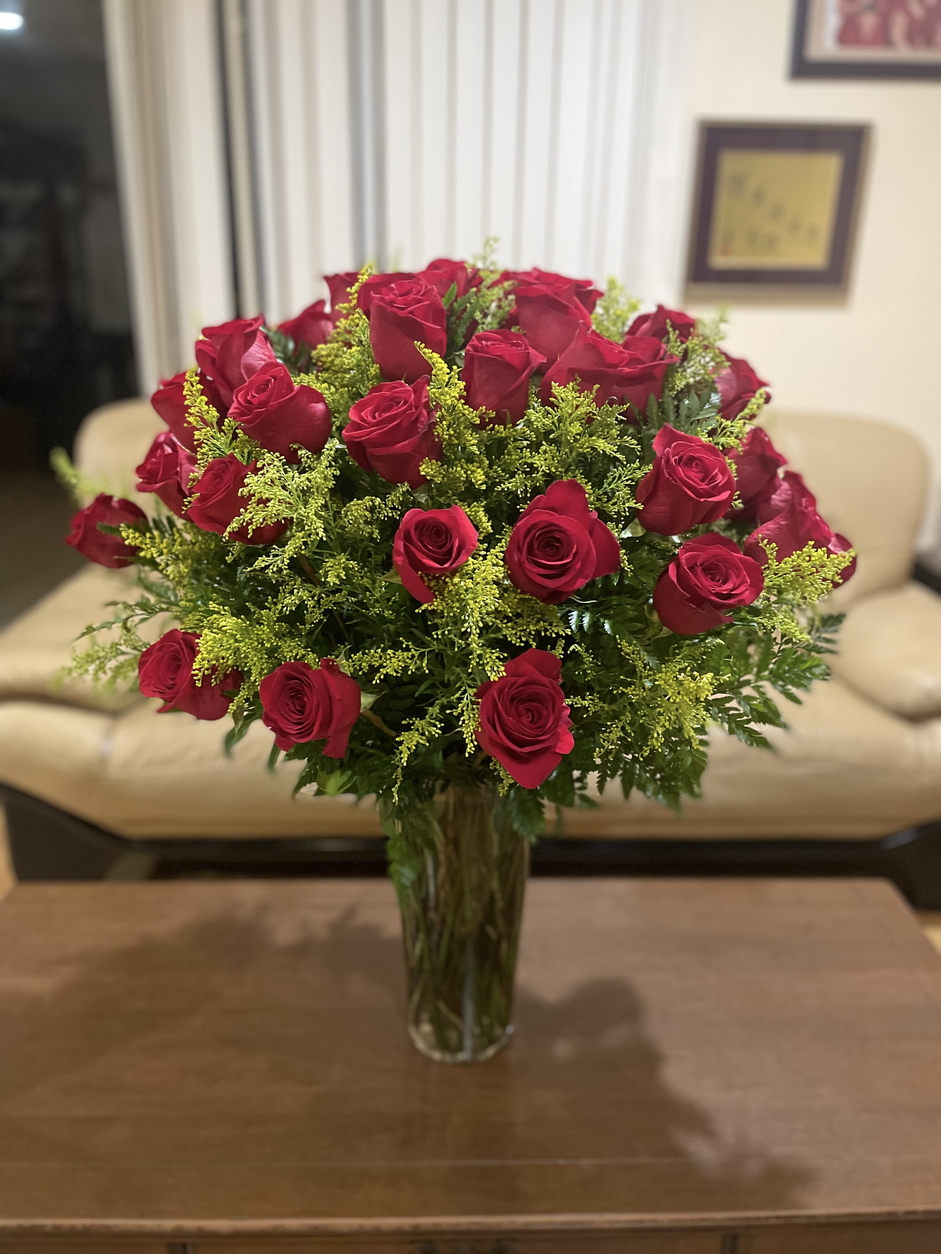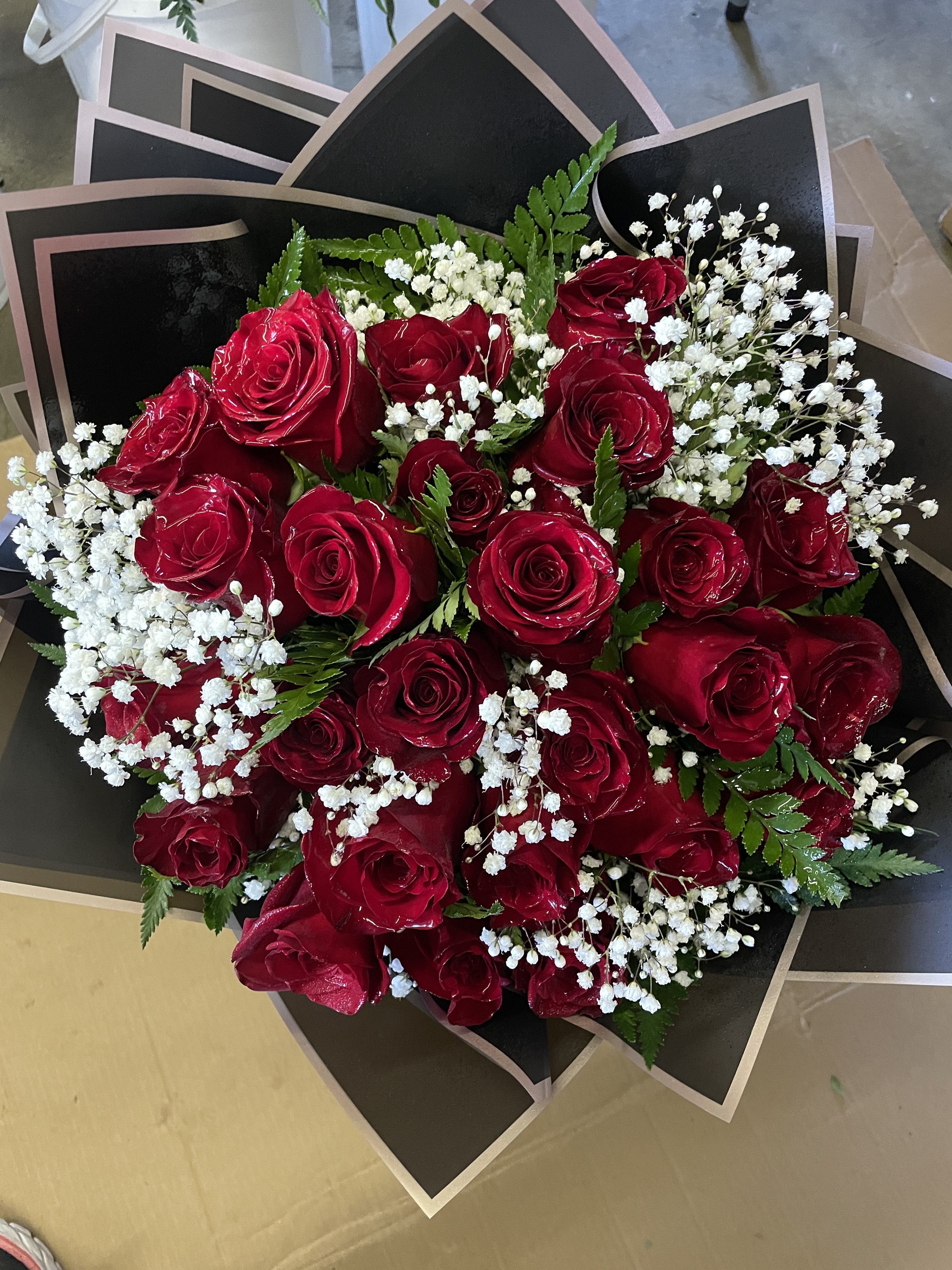 Elegant long stem roses with greenery & baby’s breath. Arrangements begin at 1 dozen roses, please feel free to specify the amount of roses you want. Optional finishes: beautifully wrapped with tissue paper or furnished in a beautiful vase.
