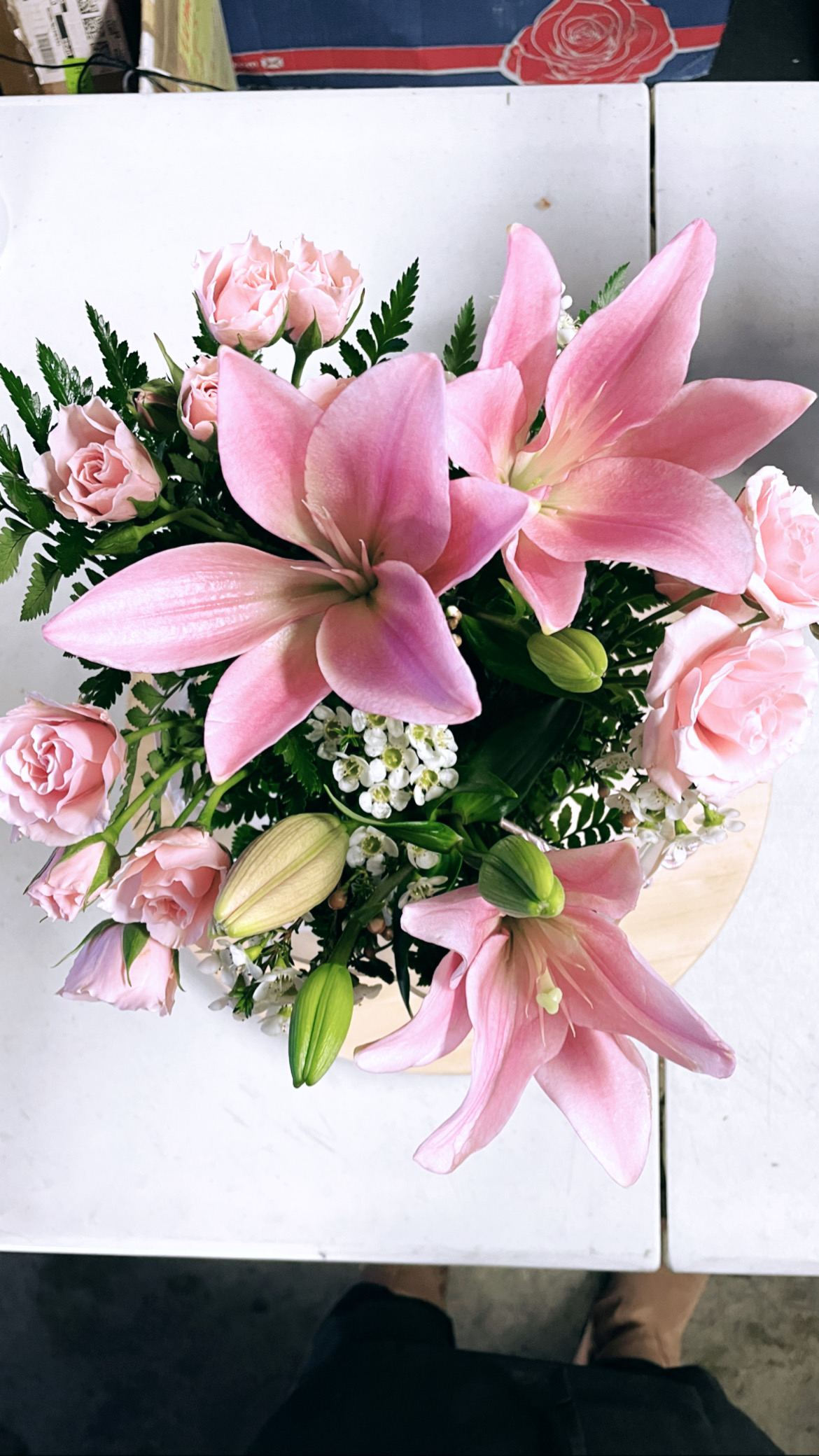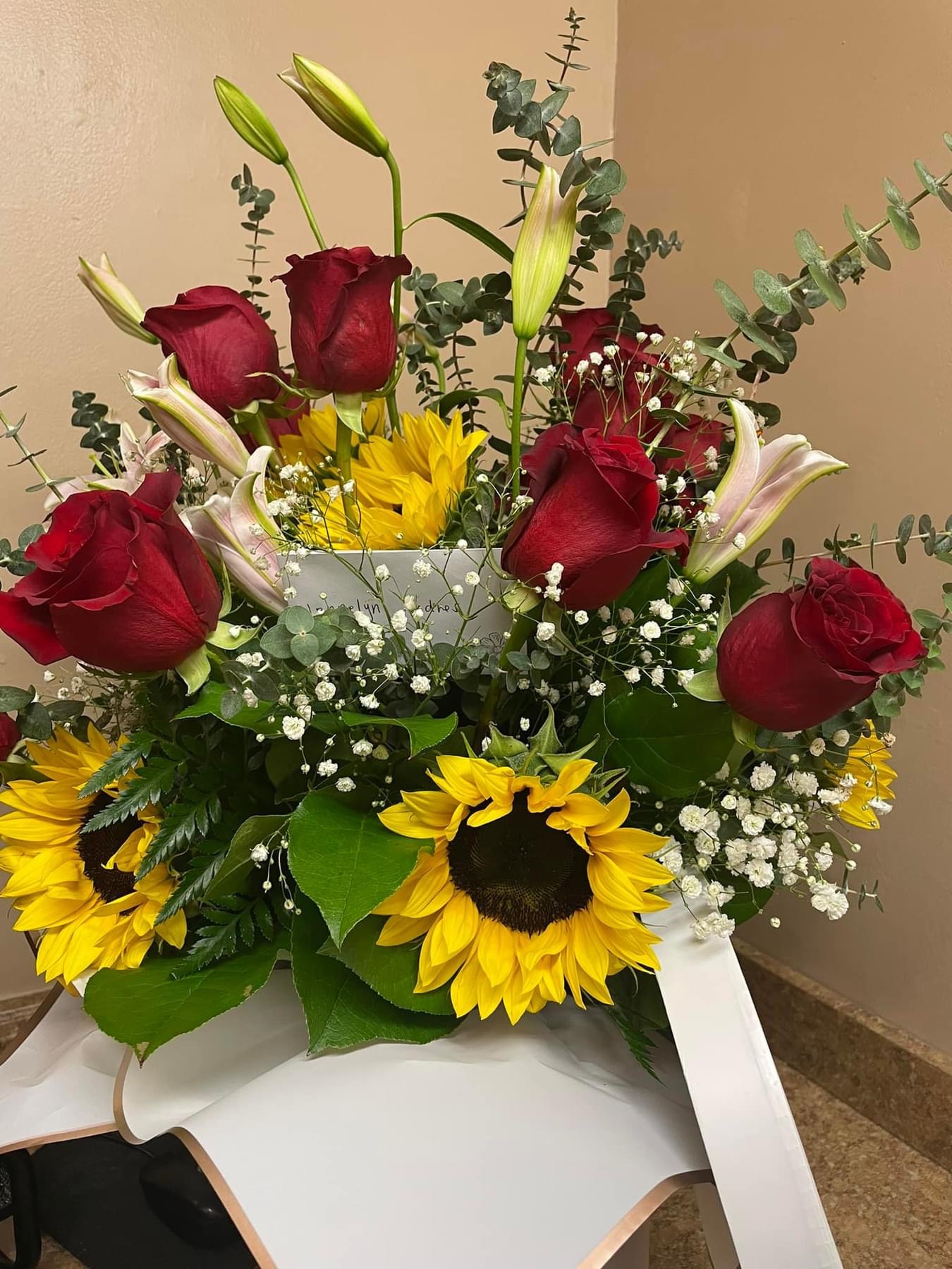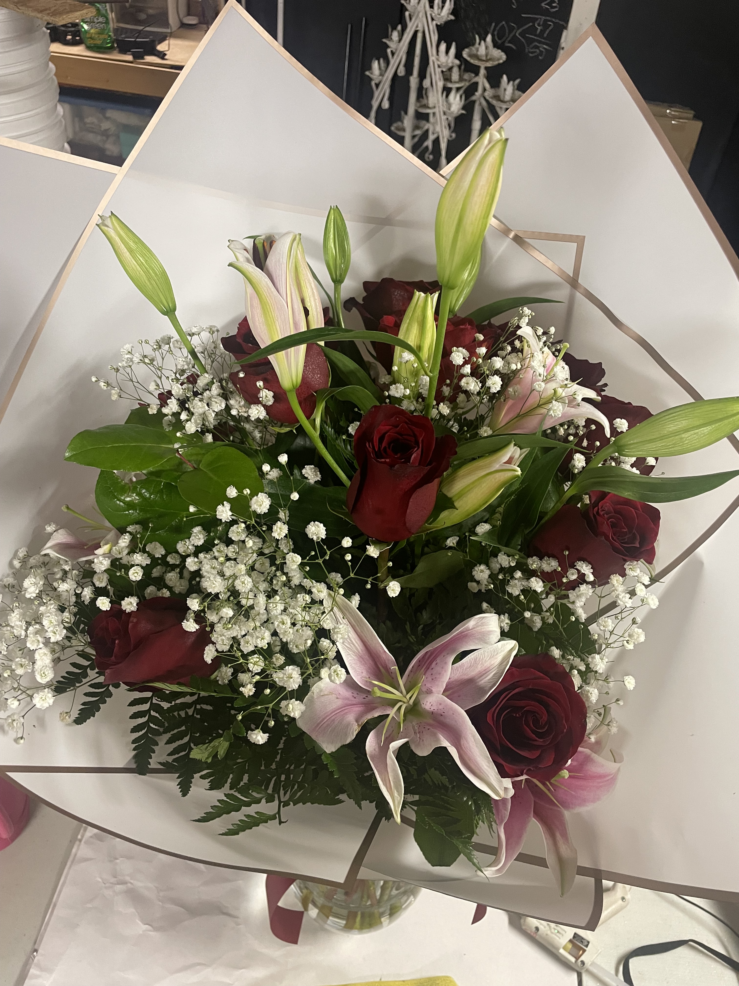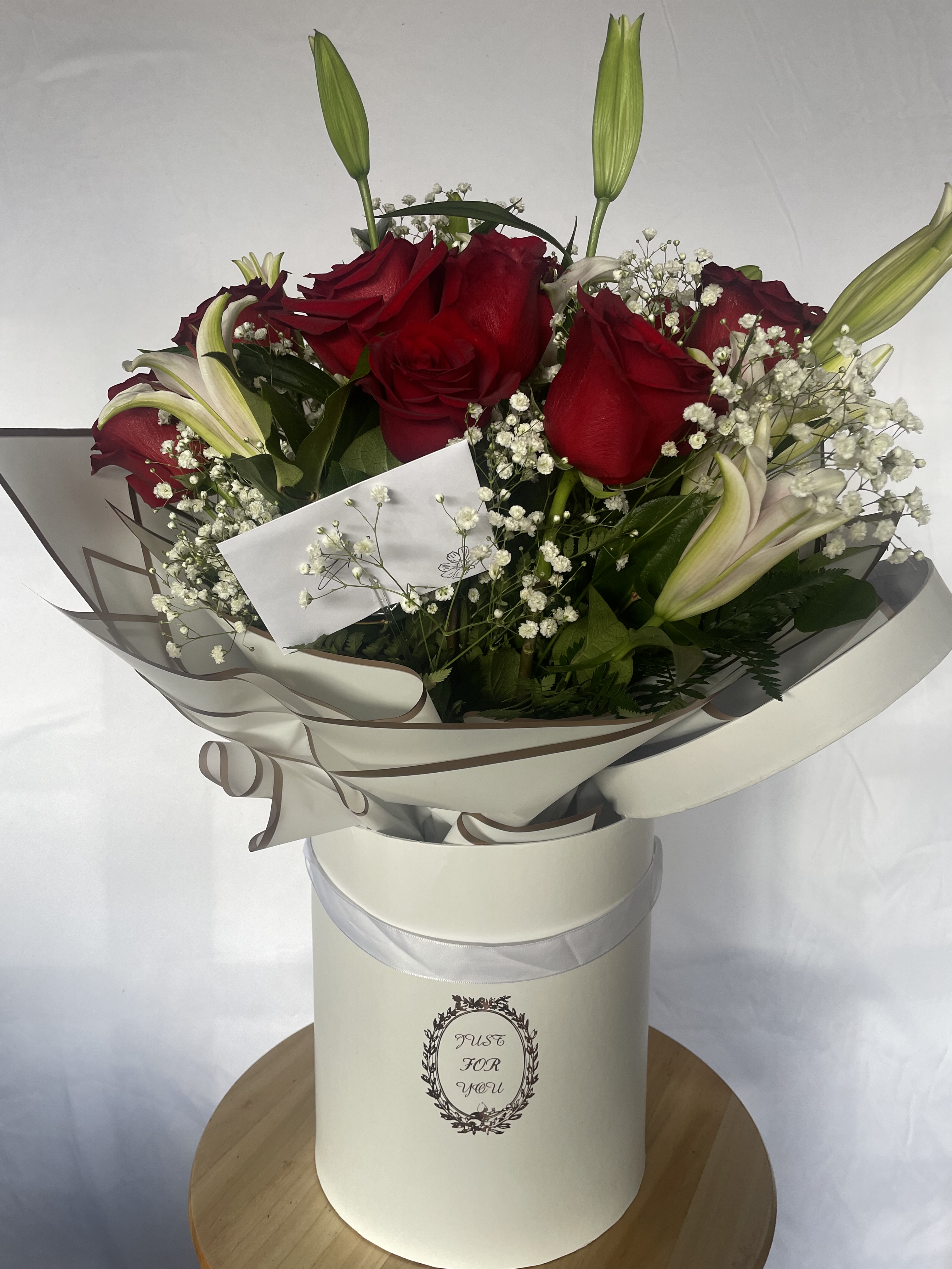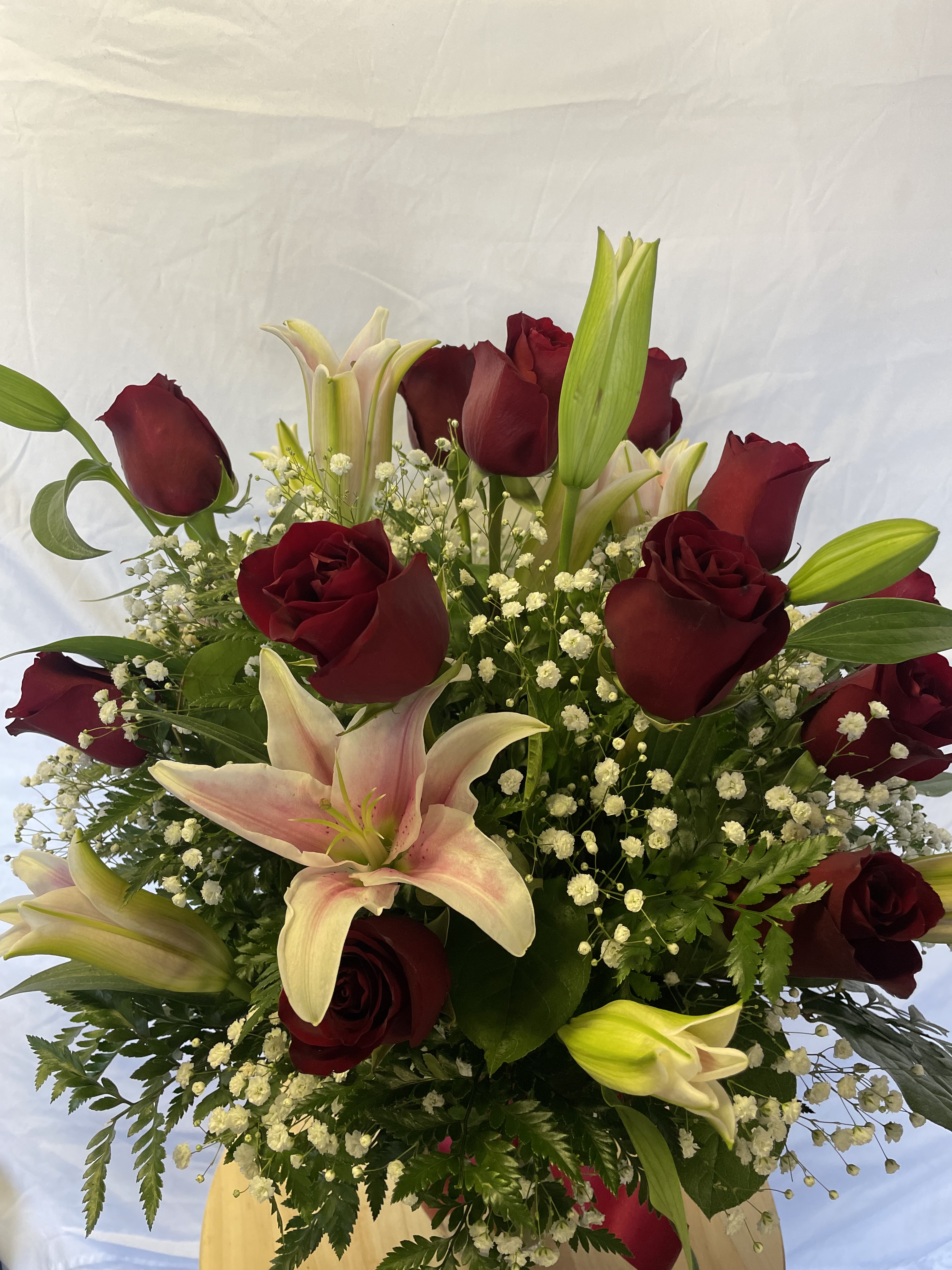 Elegant long stem roses with lilies starts at 1 dozen roses and up, please feel free to specify the amount of roses you want. Optional finishes: beautifully wrapped with tissue paper or furnished in a beautiful vase.