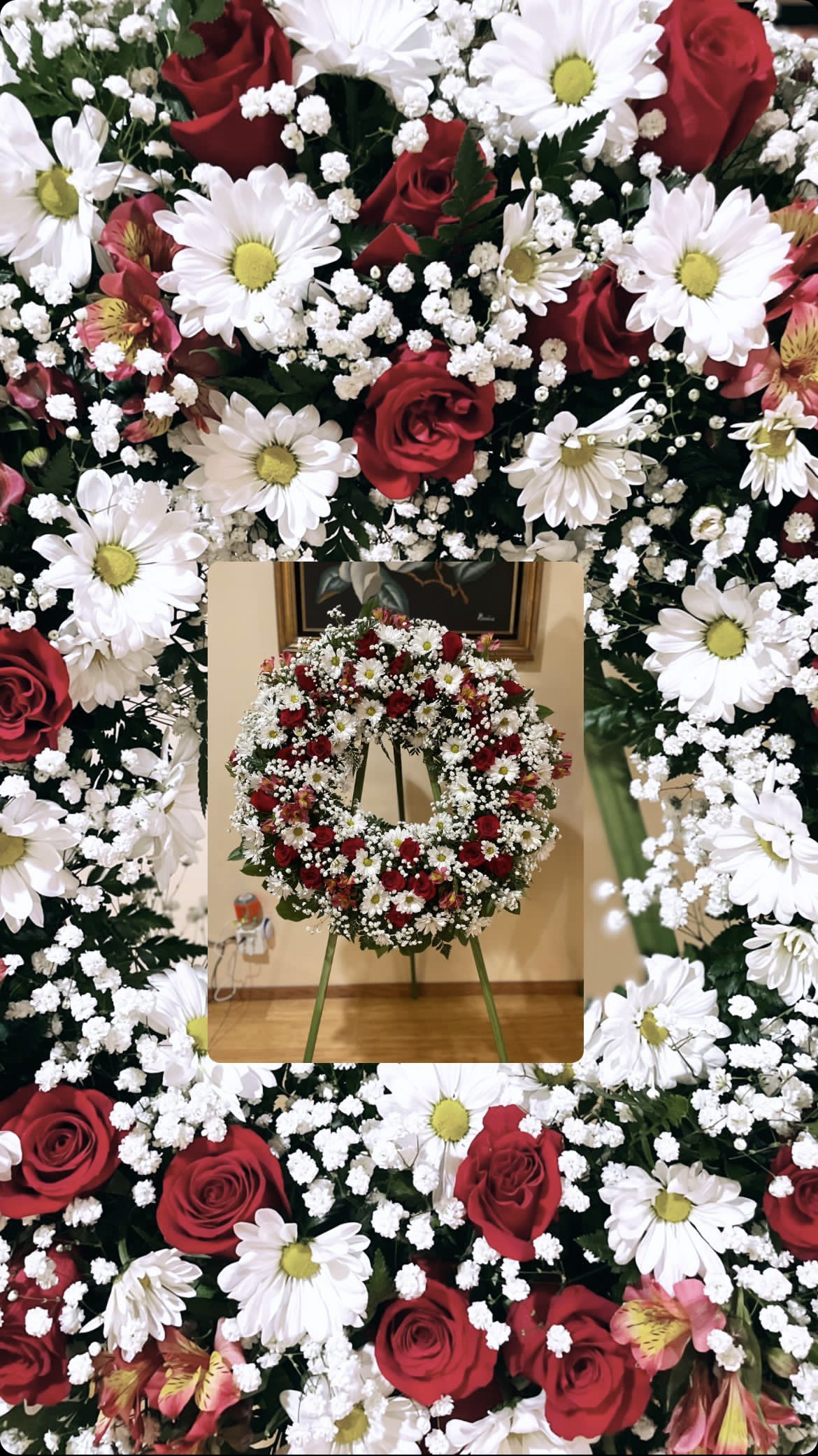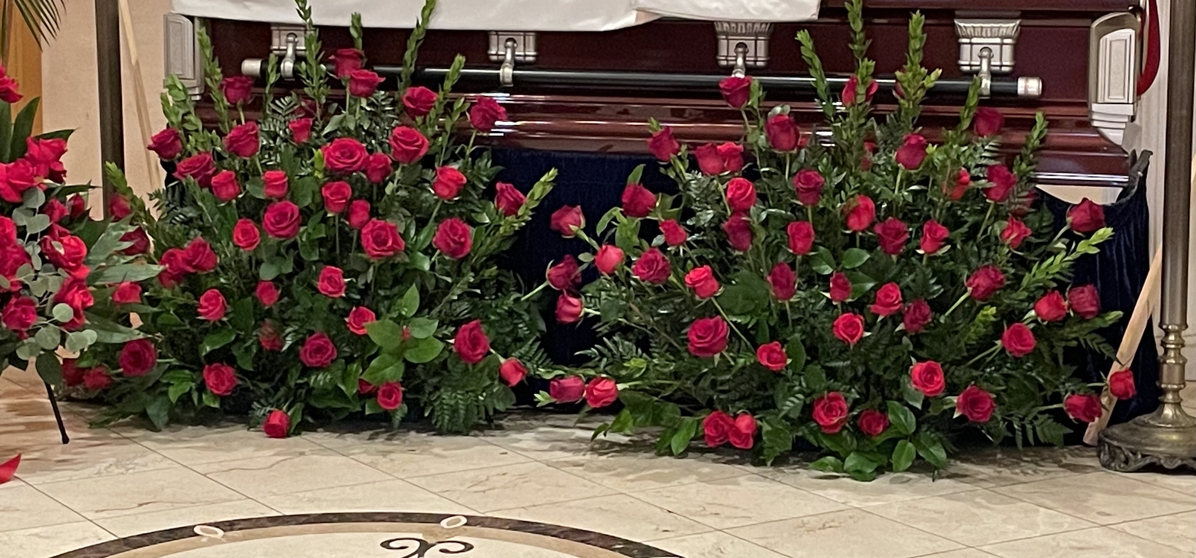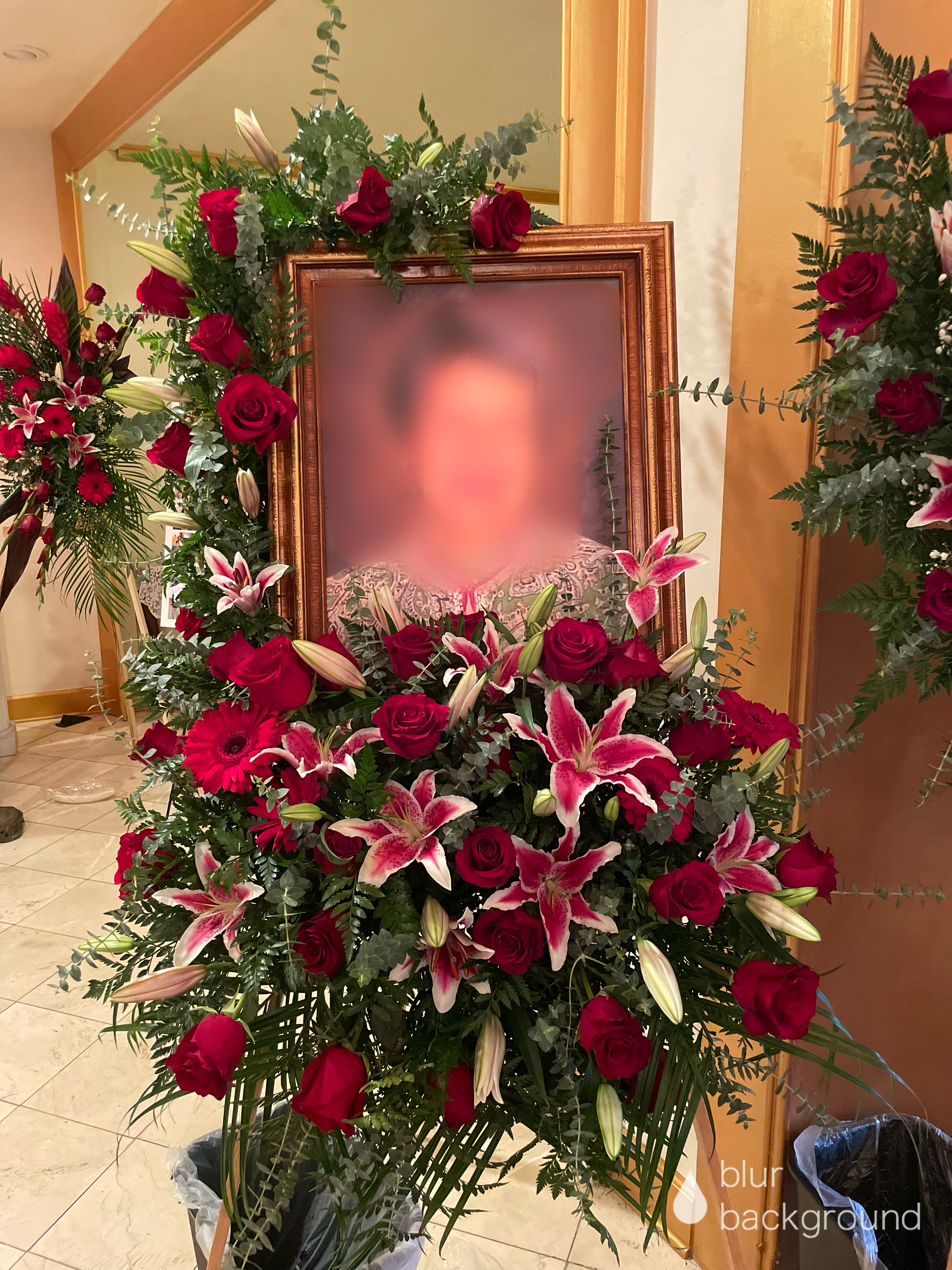 Honor the memory of your love one with this beautiful display bouquet. Designed to surround your favorite photo. This bouquet features, red roses, lilies and red Gerber daisies and lush greenery. Arrangement does not include picture frame. Colors and floral can be personalized to your request if available. We only use the freshest flowers available so varieties and colors vary due to local and seasonal availability.