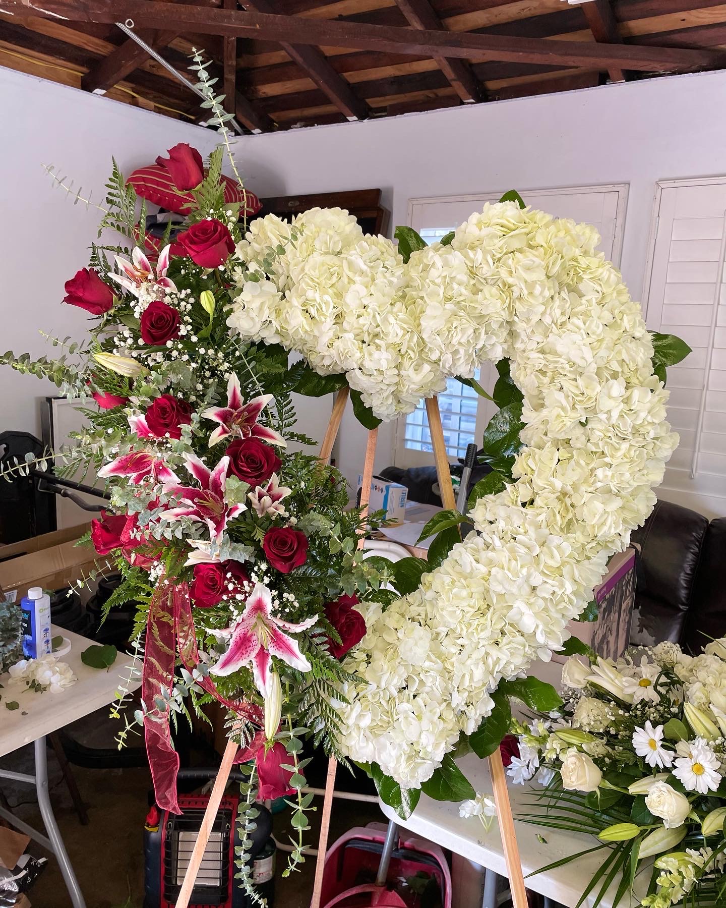 This stunning standing cross is created from fresh white hydrangeas designed with a vibrant cascade of red roses. We only use the freshest flowers available so varieties and colors vary due to local and seasonal availability. Colors can be personalized to your request if available.