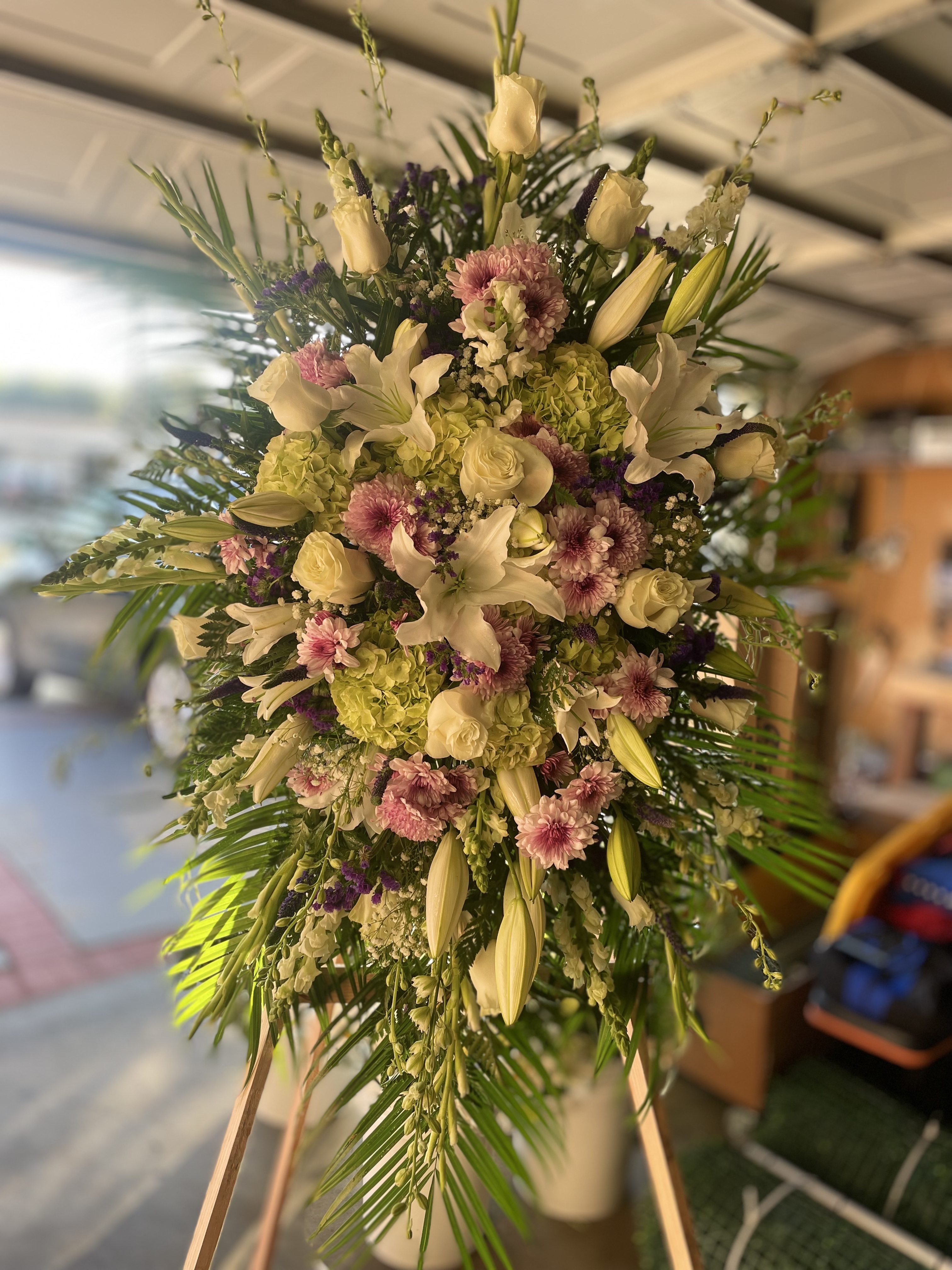 Remember their kindness and love with our variety selections of standing sprays. We can create a loving tribute for those left behind each crafted with fresh blooms. We use only the freshest flowers available so varieties may vary due to local and seasonal availability. Colors can be personalized to your request if available.
